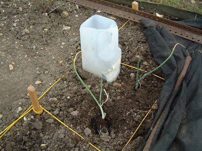 However, as the SFG is on my exposed allotment I have protected them for a while with cut-off milk containers. These will be removed in a couple of weeks when the onions have hardened off. Note: the container is not yet over the onion in the photo below.
