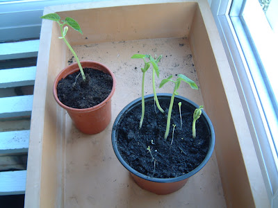 The French beans I sowed last week have germinated and then grown quickly into tall, almost ‘leggy’, plants. It’s too cold to plant them yet, so to establish good roots I’ve planted them on into individual pots.