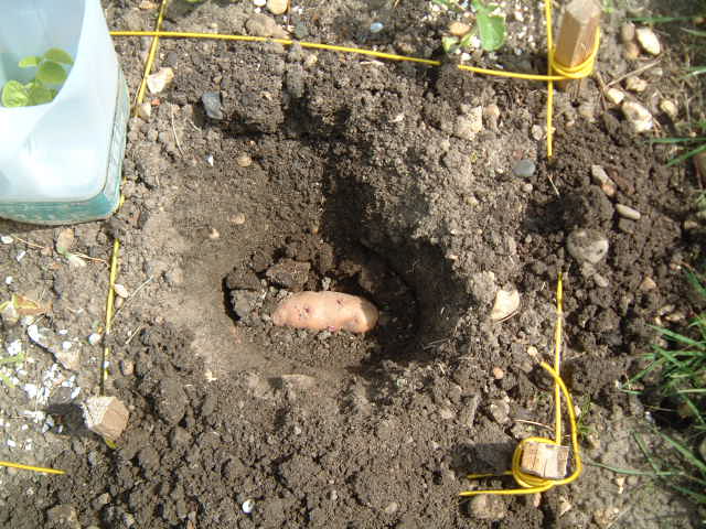 First I dug a hole about 200mm deep and put a little compost in the bottom. Next, I put the potato onto the compost taking care not to damage the ‘chits’.
