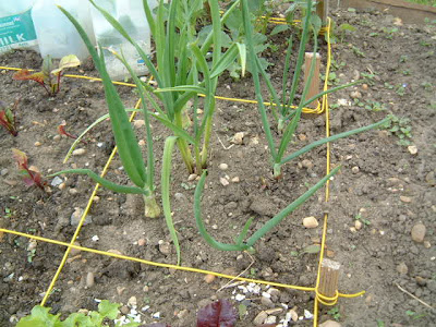 As for the onions, the photo below seems to show that the onions on the left, planted from seed, are doing better than those on the right, grown from sets. We’ll see. The garlic in the centre looks okay but has split into several growing spears.