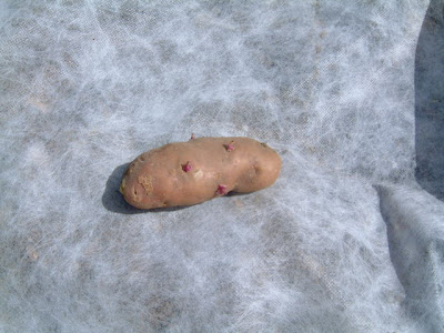 It’s still cool in the wind and at night but the patch is doing well. I’ve not had a lot of success ‘chitting’ the pink fir apple potato. However, as you can see below, there are little sprouts, so I’ve “elected” to plant it today!