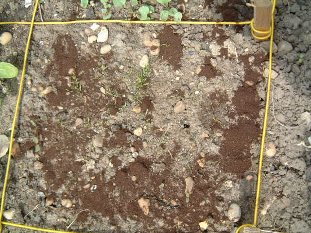 The carrots in the bottom right corner (see close-up below) have germinated but are still small; the brown stuff around them is spent coffee.
