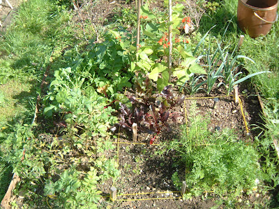 The leeks and rocket (back left) are good and the runner beans have taken off. Hard to see but the chard is also doing well. The next photo shows this more clearly (rocket to the left).
